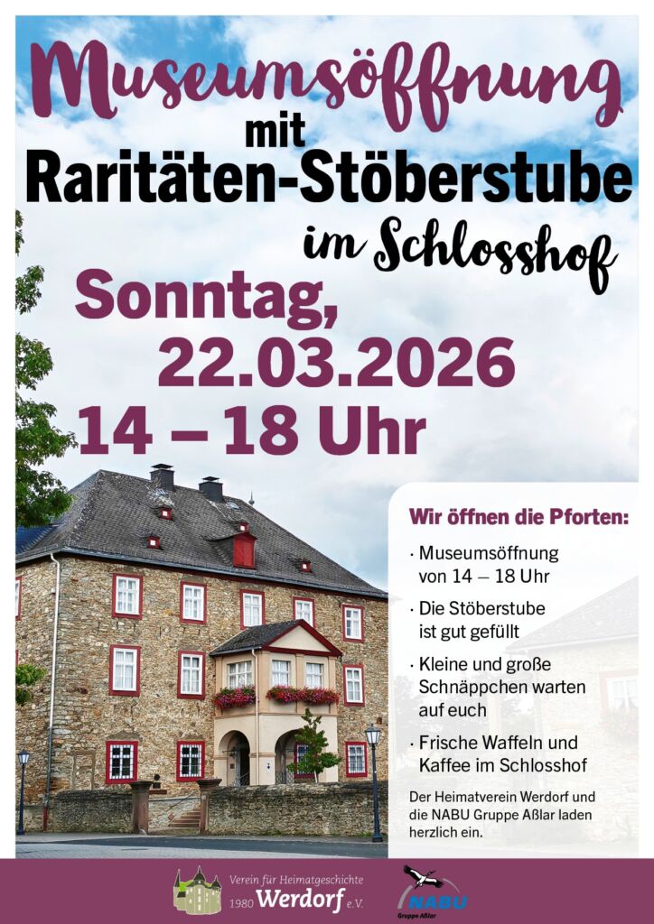 Das Heimatmuseum im Schloss Werdorf wird am Sonntag, 22. März, von 14.00 Uhr bis 18.00 Uhr geöffnet sein. Zusätzlich zu einer prall gefüllten Stöberstube gibt es im Schlosshof frische Waffeln und Kaffee.
